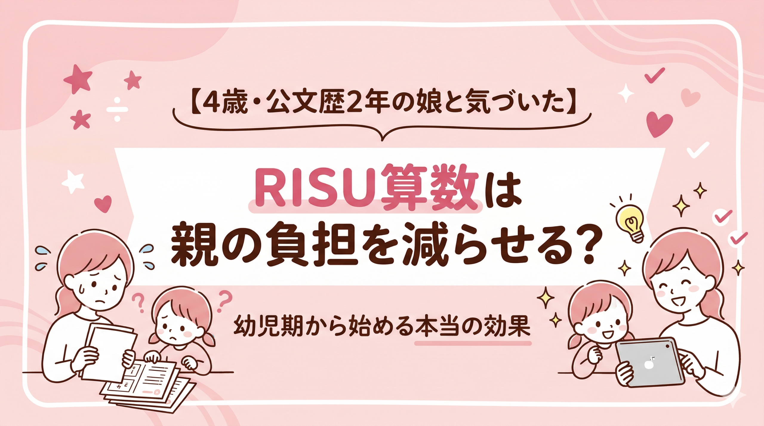 4歳・公文歴2年の家庭が、RISU算数で親の負担は本当に減るのかを検討。丸付け不要の仕組みや自走しやすさ、幼児期から始めるメリット、公文との違いを整理。導入前に知っておきたいポイントを分かりやすく解説します。